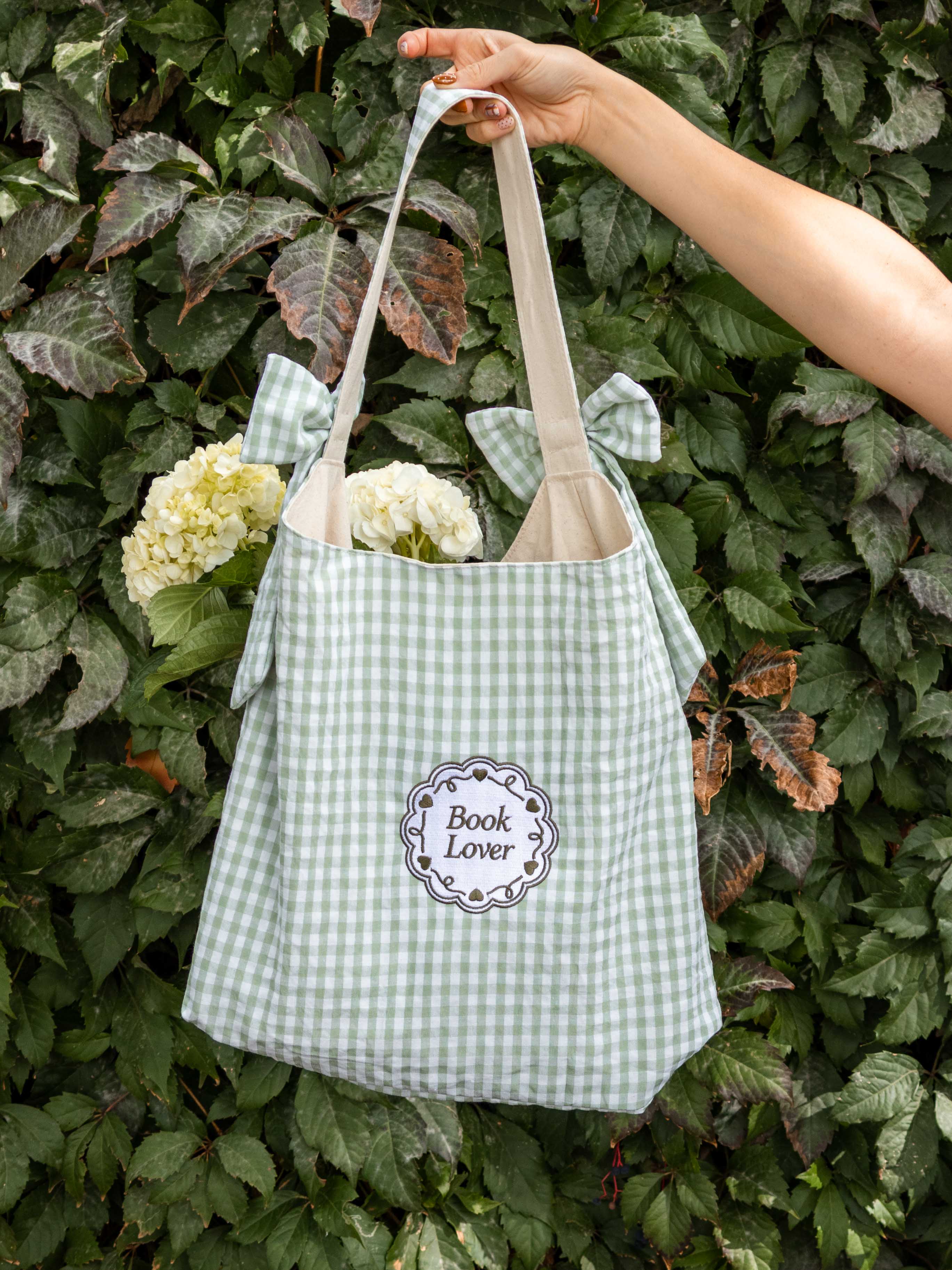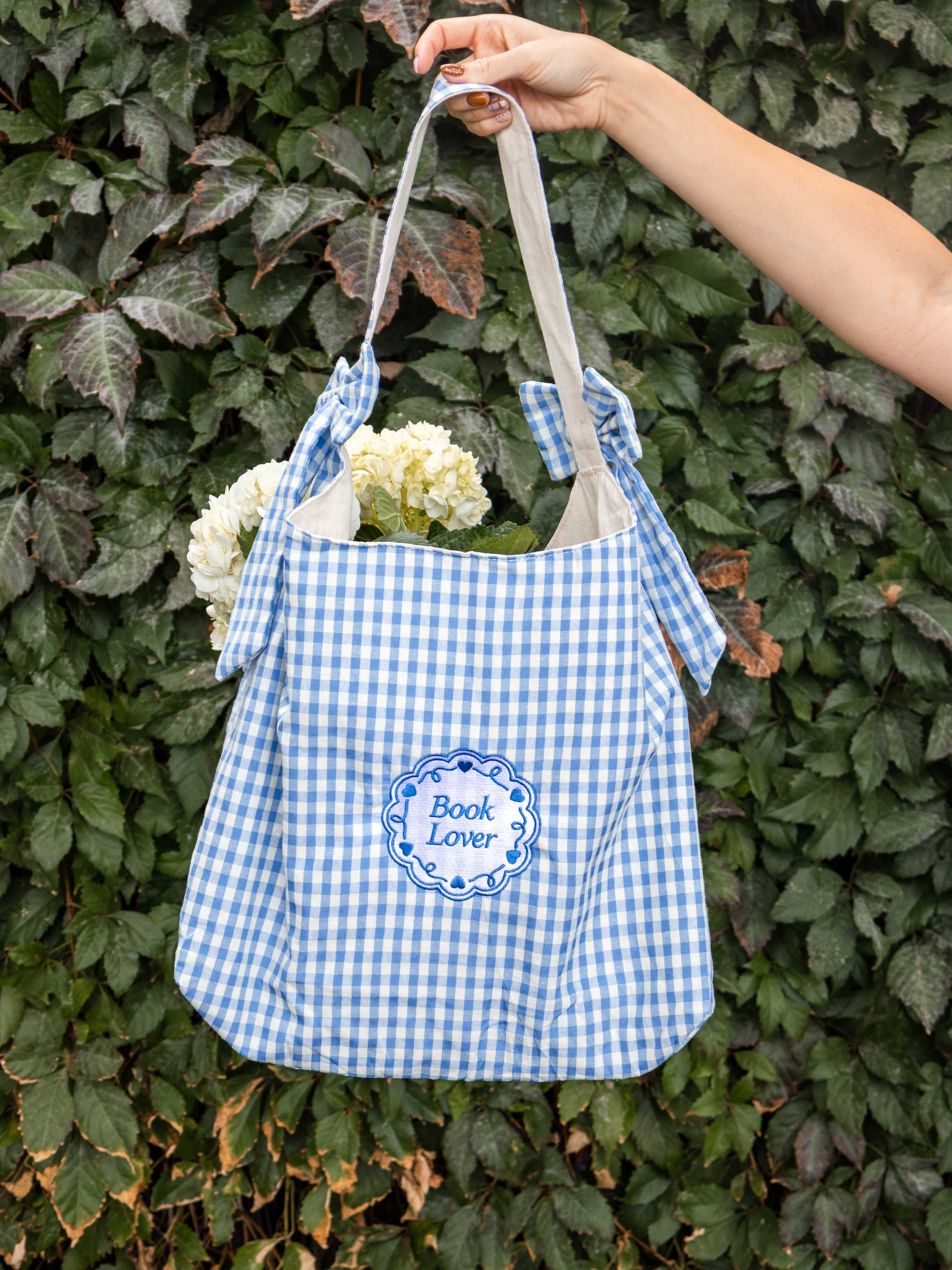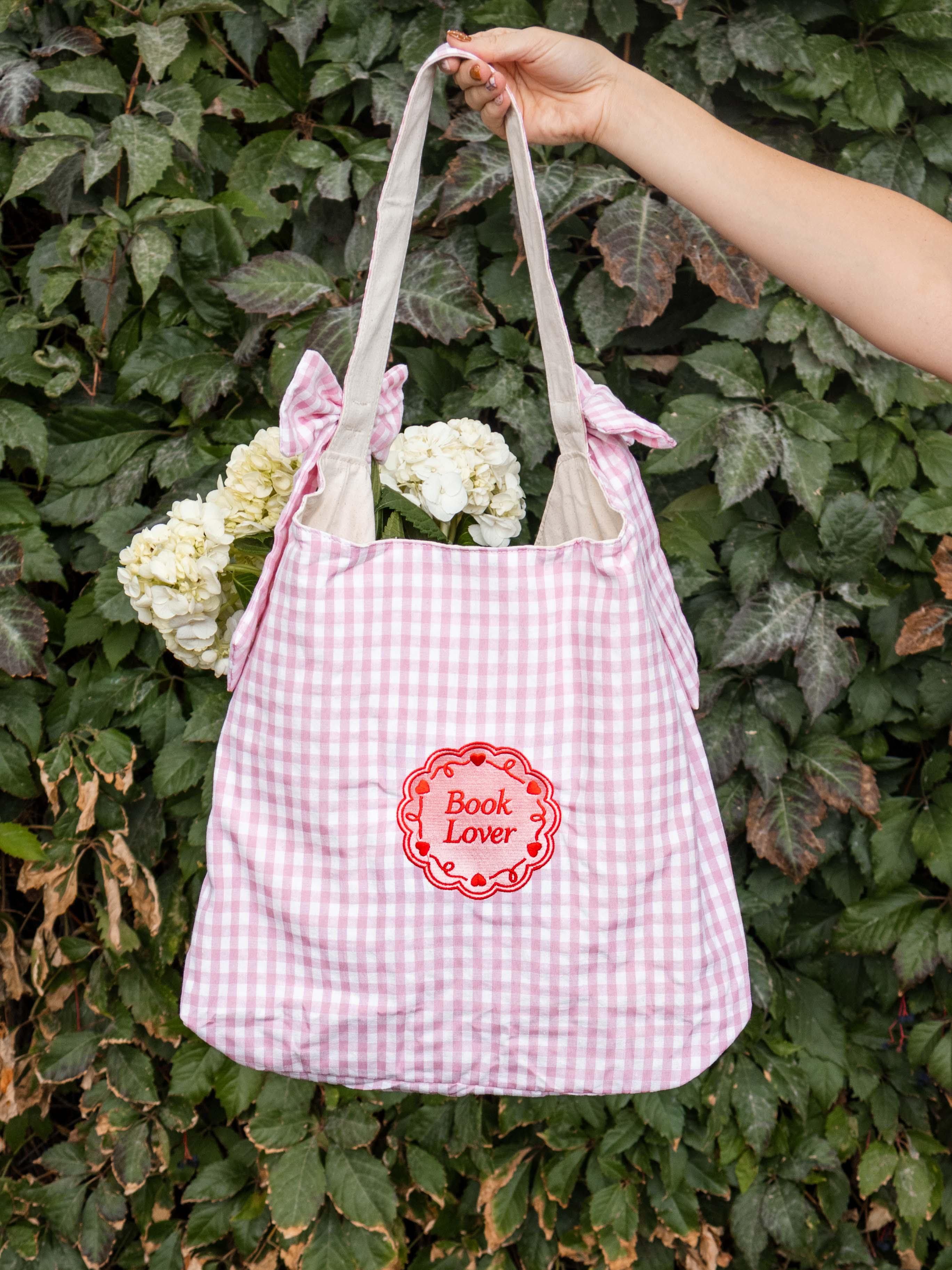 Book Lover tote bag with bows and pink gingham fabric, embroidered design, reader gift