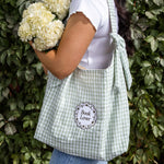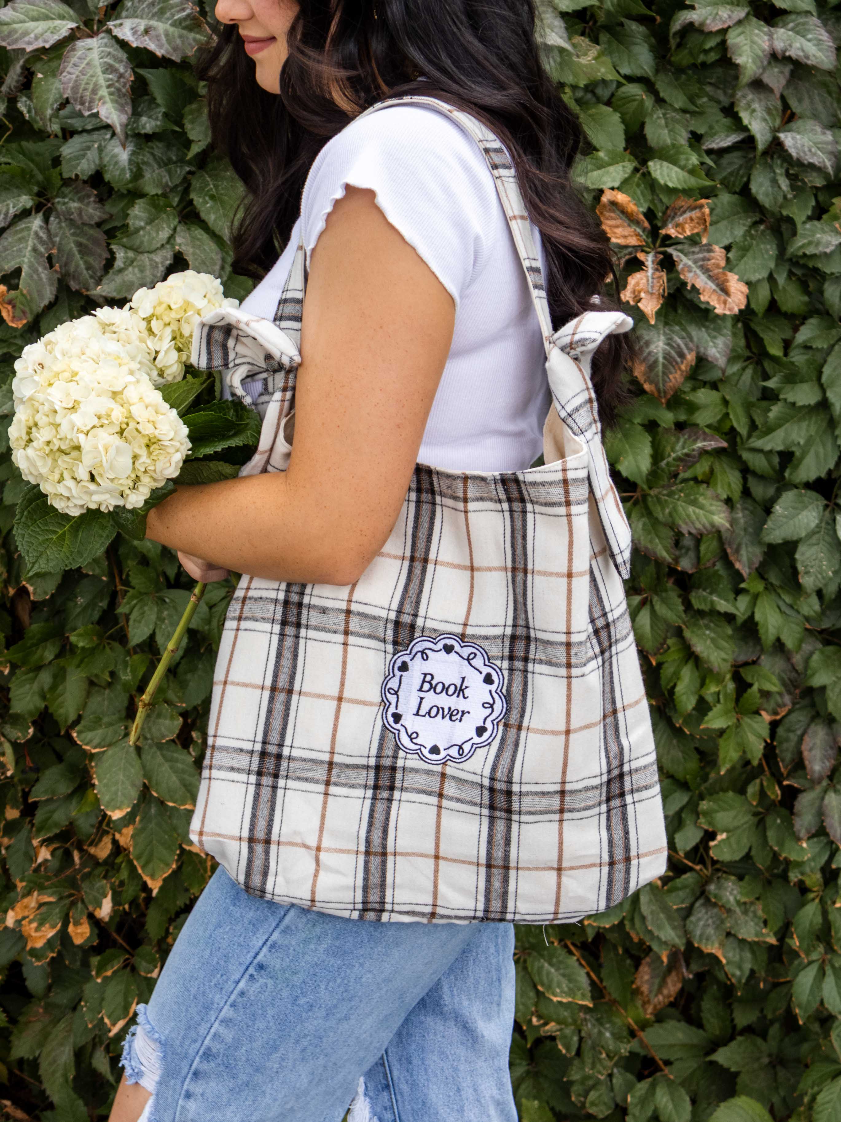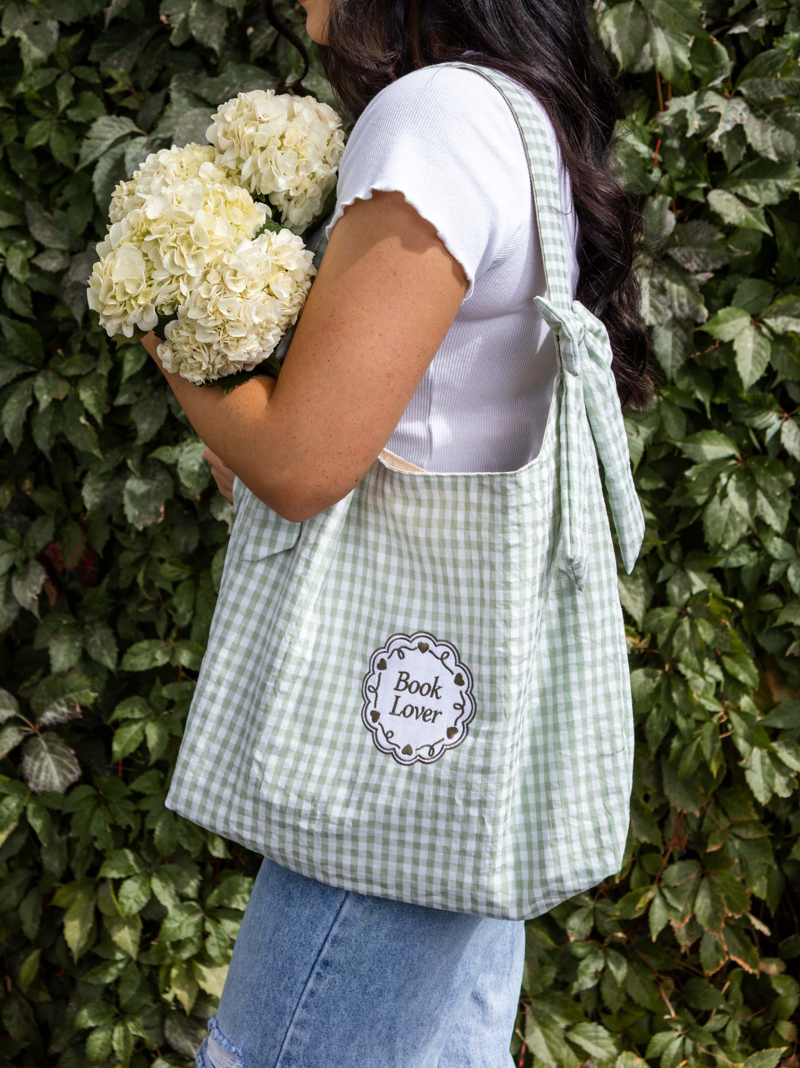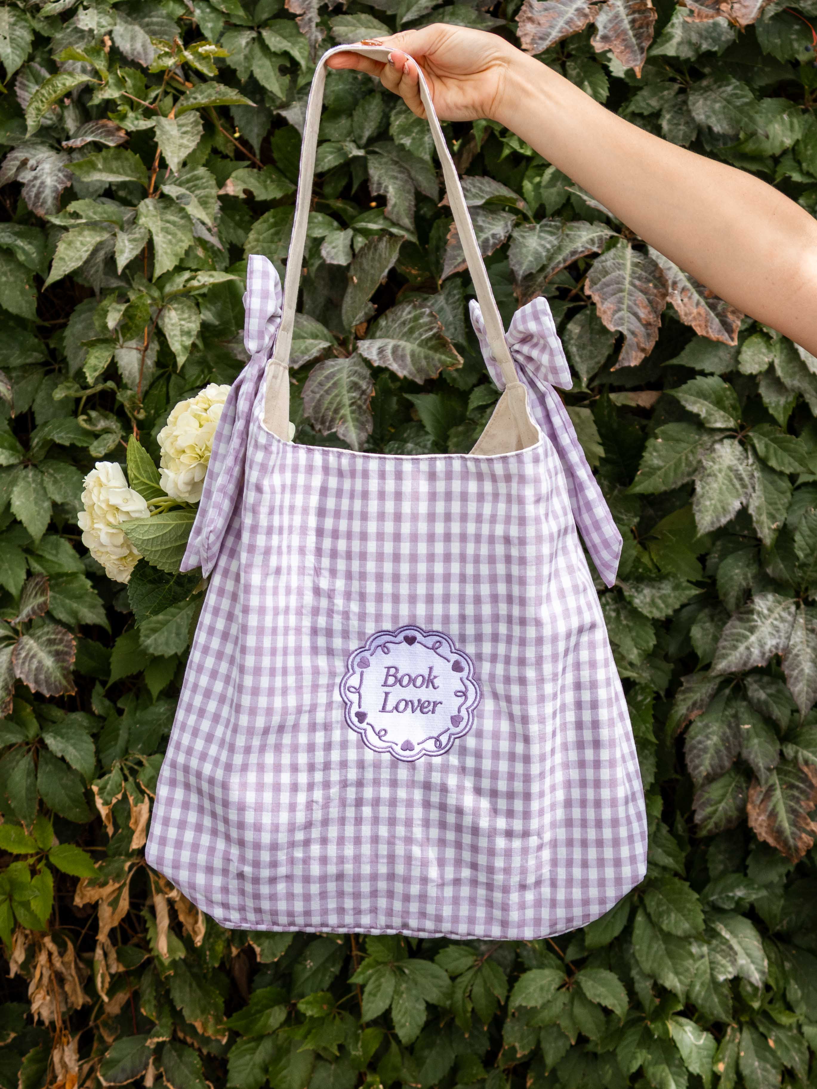 Book Lover tote bag with bows and pink gingham fabric, embroidered design, reader gift
