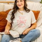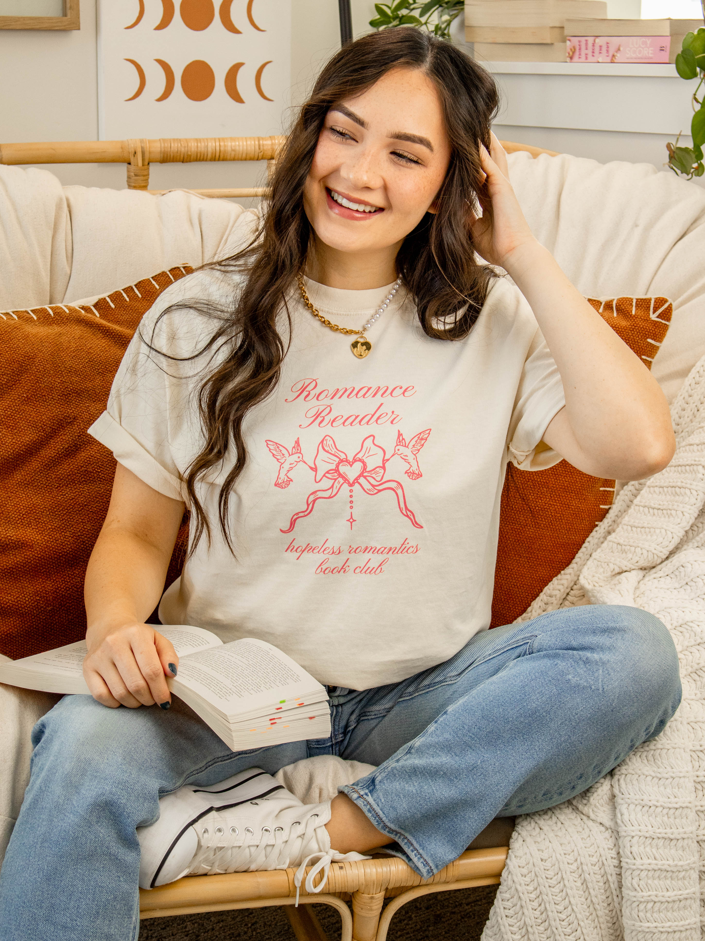 For the romance readers 🎀 The cutest tee!! This color is a gorgeous cream/off-white, paired with a baby pink print. Come join the hopeless romantics book club 💖