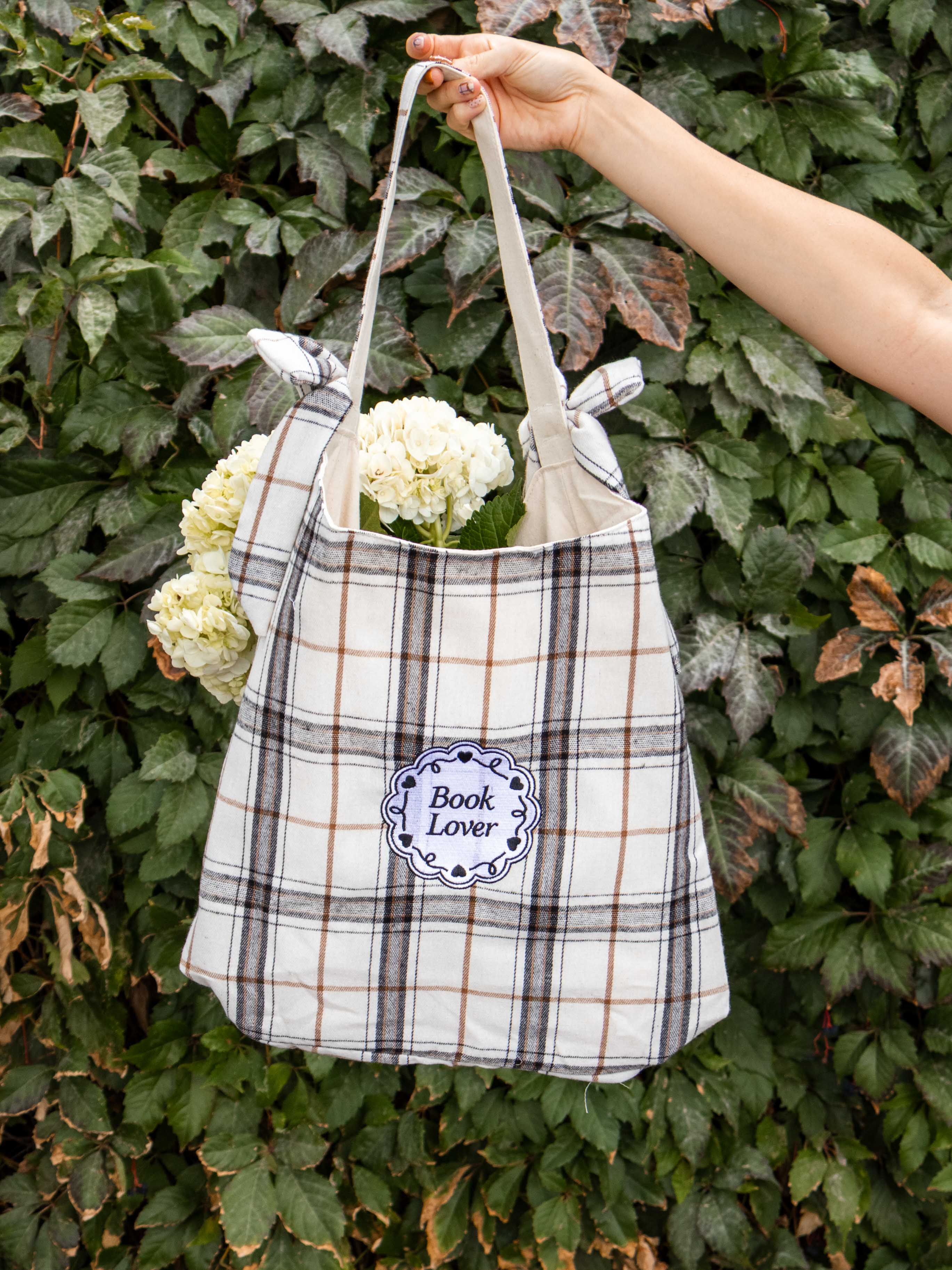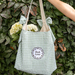 Book Lover tote bag with bows and pink gingham fabric, embroidered design, reader gift